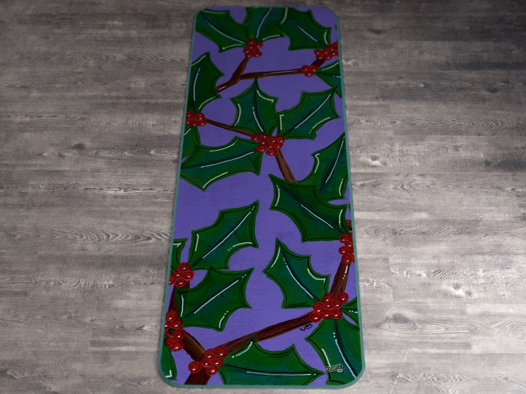 Welcome a splash of colour into your daily routine with our designer yoga mat, showcasing the seasonal December birth flower – the Holly bush.